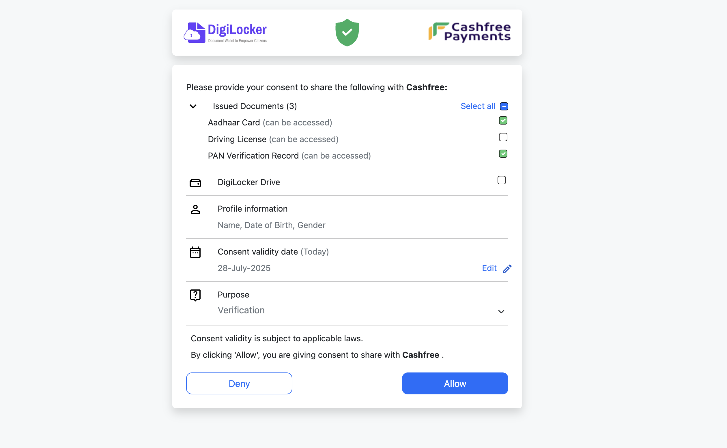 DigiLocker access is strictly based on user consent and is compliant with the Digital Personal Data Protection Act (DPDPA), 2023.