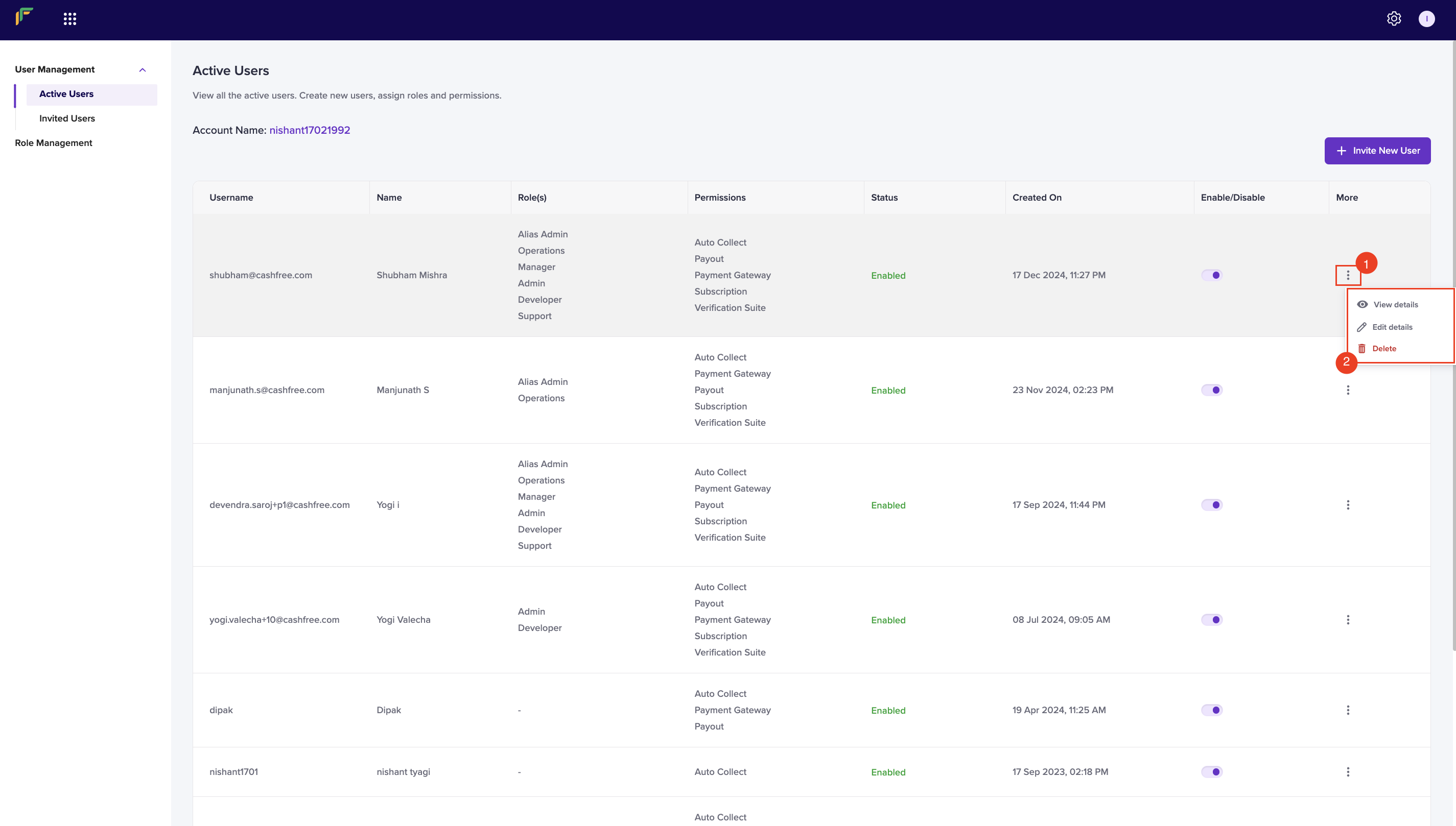 - Default - You can select a default role created by Cashfree Payments and assign it to your users. Find the list of default roles that are readily available for you below: