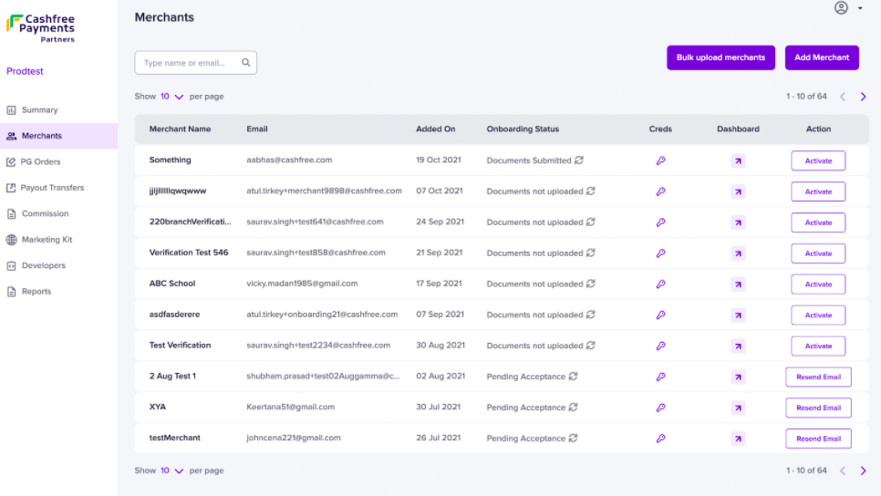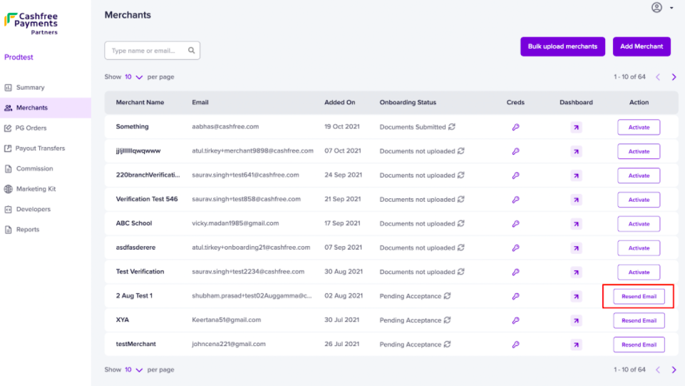 If the merchants did not verify their email ID, you can resend the verification email to them by clicking Resend Email.