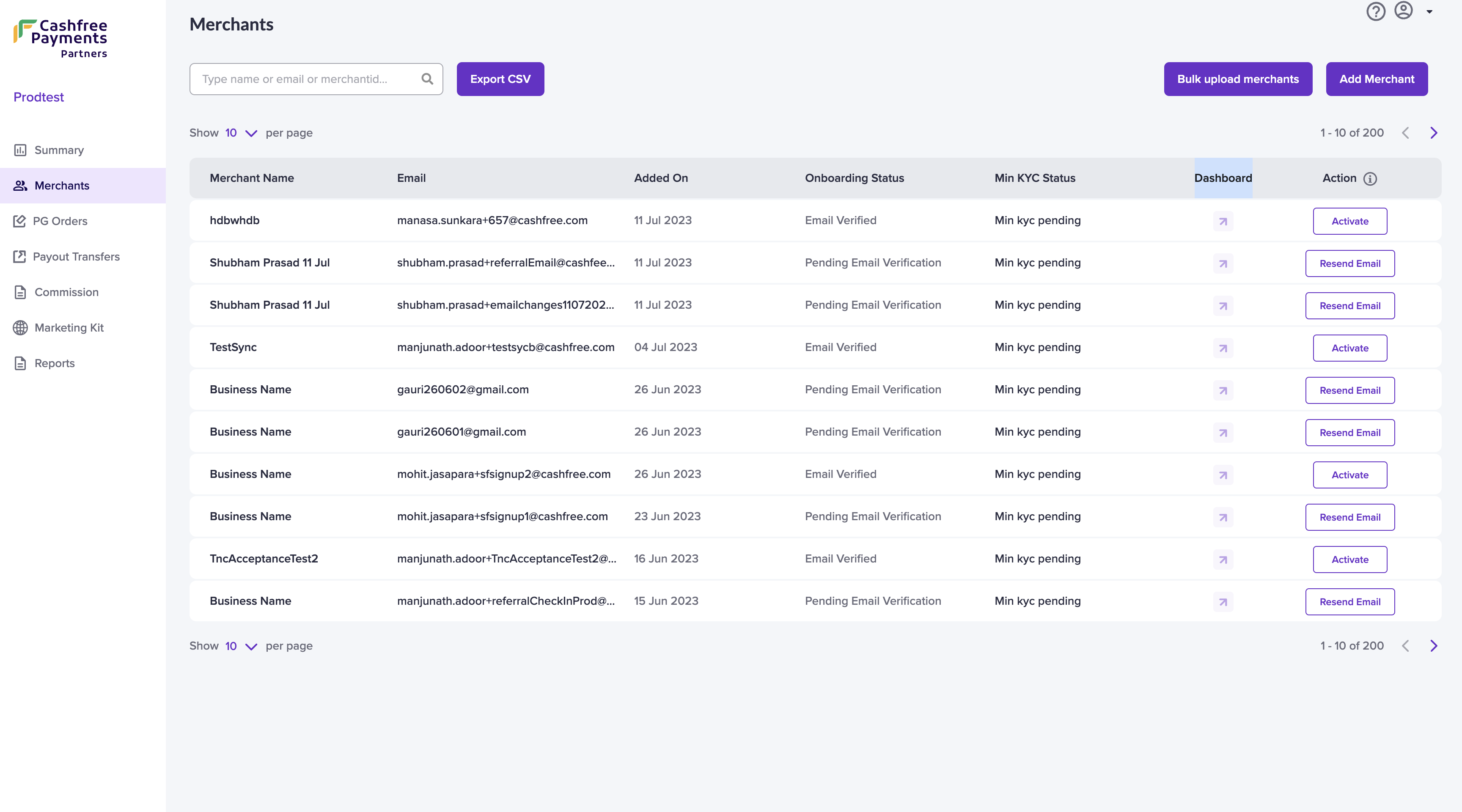 Pending Email Verification: The Merchant must first verify their registered email address. An email is sent automatically from Cashfree Payments (from care@cashfreemail.com) to the merchant email ID you specified when you added the merchant details.If the merchant has not received the email in their Primary inbox, please ask them to check it in the Spam folder. If the merchant has not received the email you can use the Resend Email email to send the verification email again. Email Verified: This means that Merchant has verified their email address, and can now start their KYC verification process.