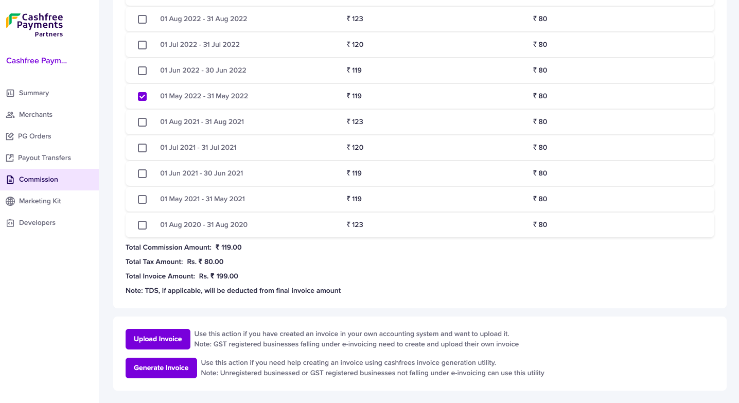 If you are GST registered and shared the GSTIN details with Cashfree Payments, you will see the GST component in the Commission section. This information is not visible to the unregistered partnerss. All GST-registered partners must share their GSTIN with Cashfree Payments as per compliance requirements. Fill out the Support Form to update your GST details.