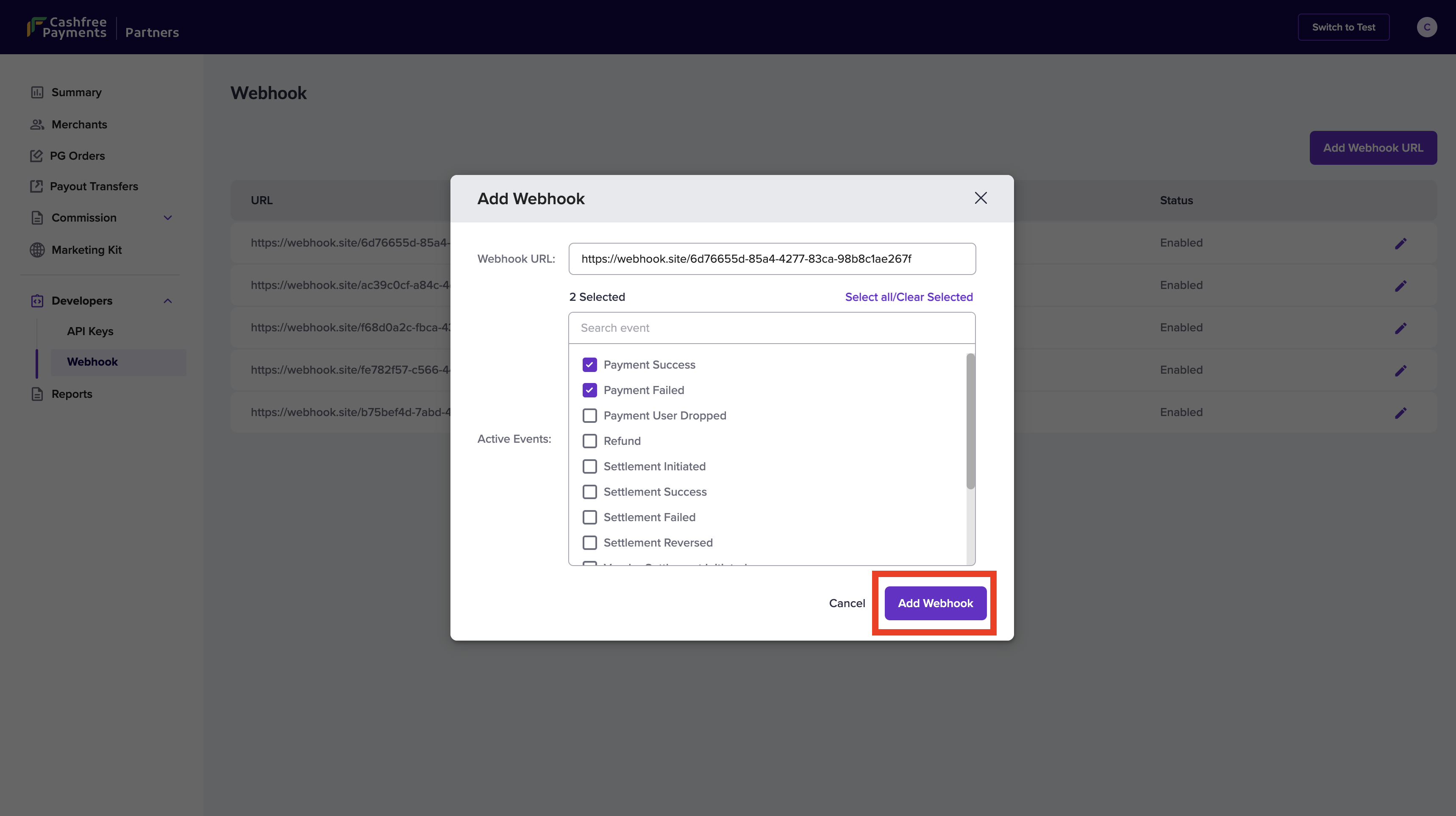 - Select the events for which you want to configure the webhooks to receive updates, and click Add Webhook.