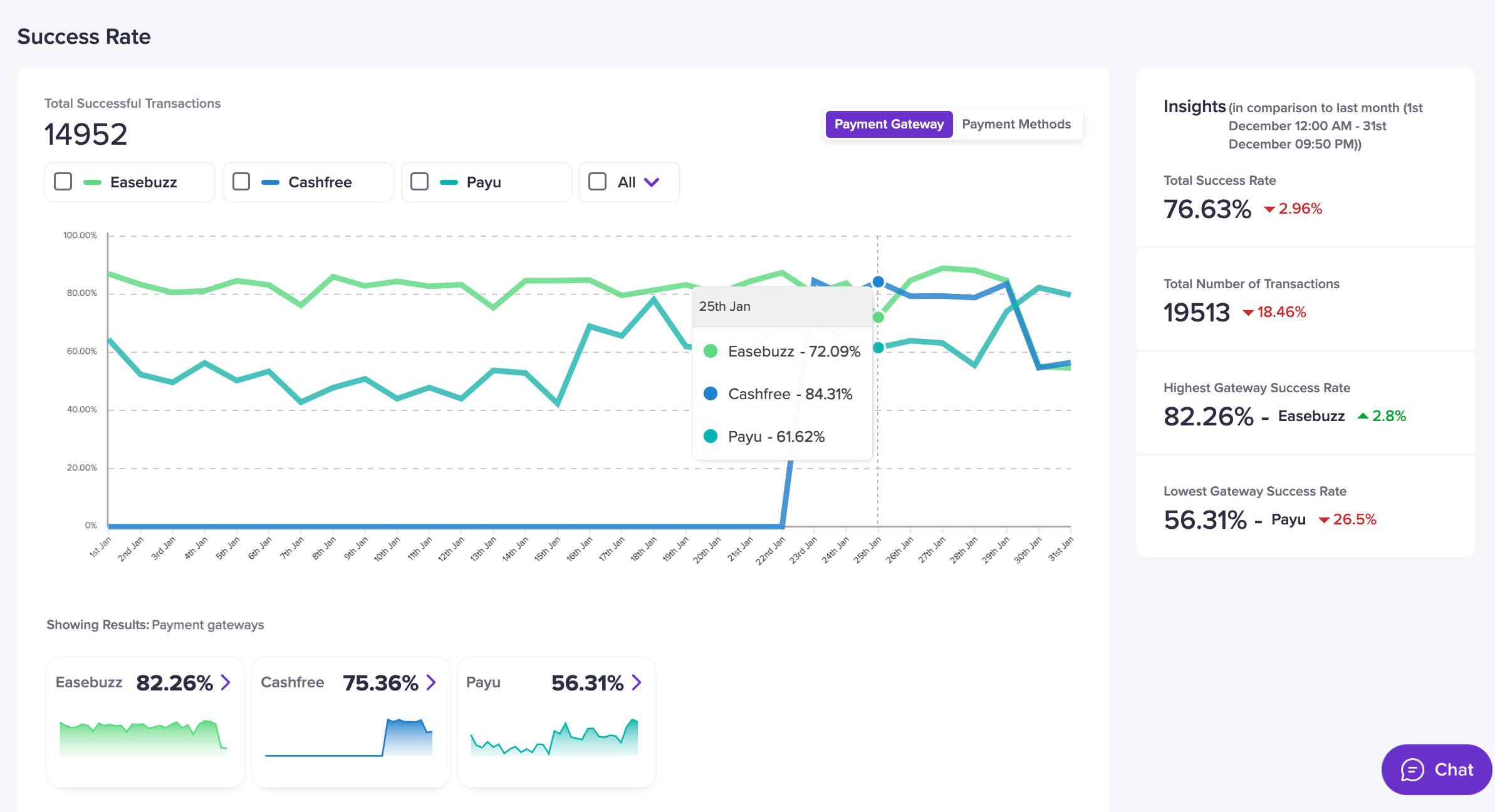Success Rate shows the percentage of successful transactions. Tracking SR helps you spot payment issues and create a smoother checkout.Transaction Analytics