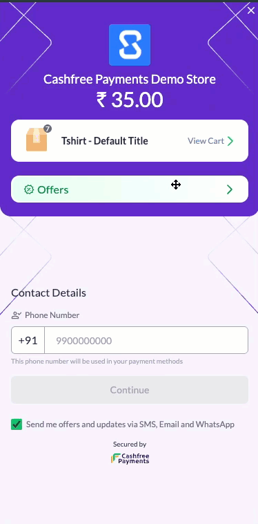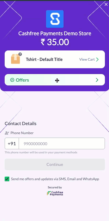 Customers can enter discount codes during checkout starting from the login page. Customer flow:- On the Cashfree checkout page, customers will see an Offers section.