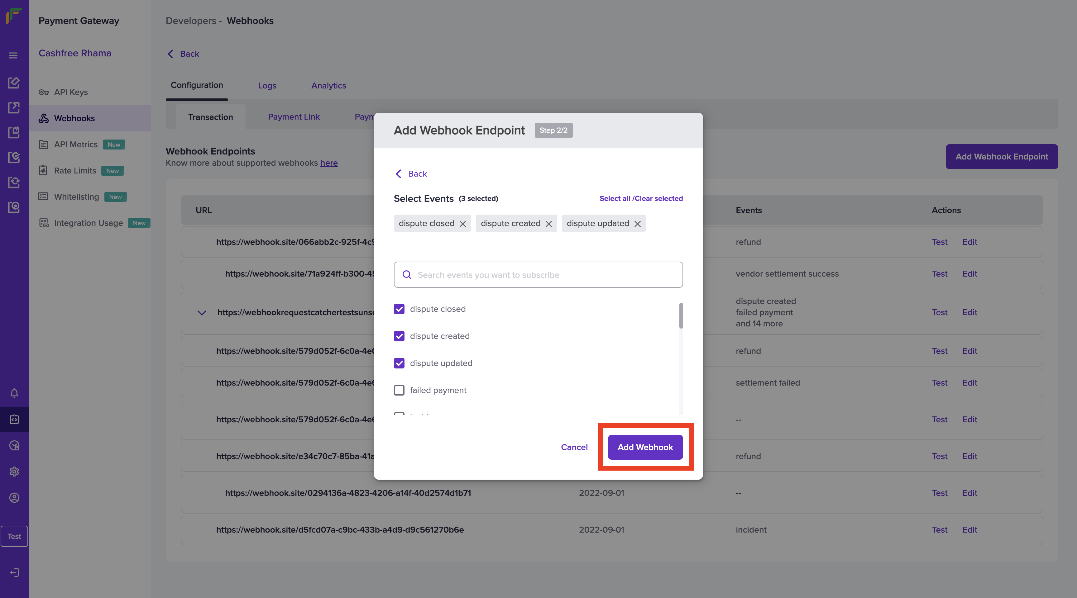 - Click Add Webhook Endpoint to create a new webhook. Enter the endpoint URL and select the webhook version using the drop-down menu. The available API versions are 2021-09-21, 2022-09-01. Click on Test to verify if the webhook endpoint returns a response. Once done, click Next.