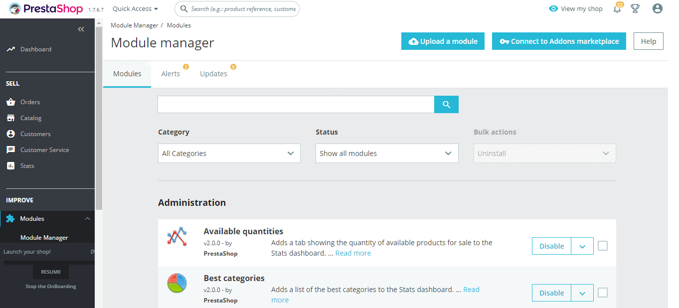 - Log in to your PrestaShop Admin Dashboard and click Modules on the left side menu.