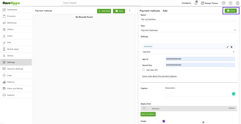 a. Enter your Cashfree Payment Gateway App Id and Secret Key.