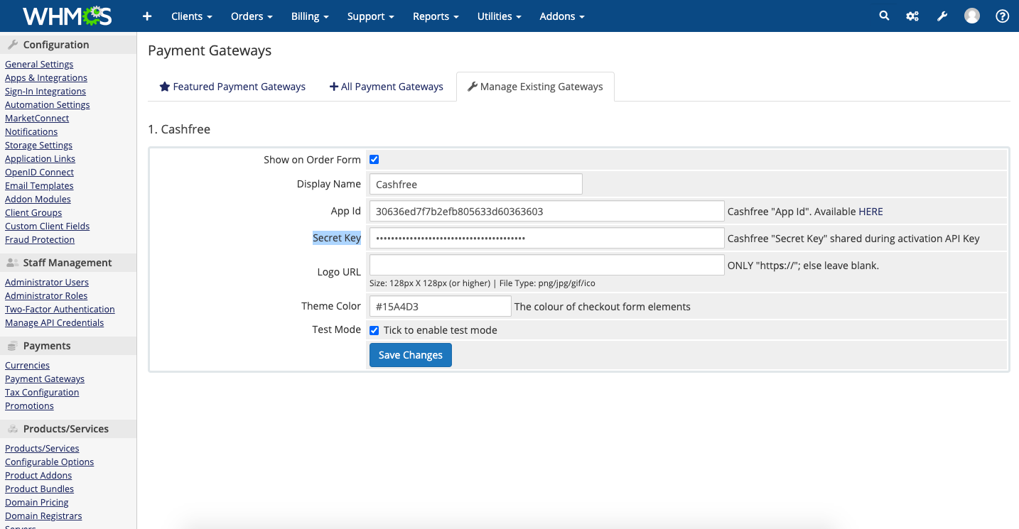 WHMCS (Web Host Manager Complete Solution) is a web host billing and automation platform. WHMCS is the market-leading platform of choice for Web Hosting Providers and Domain Registrars to automate and manage their businesses. Cashfree supports WHMCS 7 and WHMCS 8 versions for integration. To add Cashfree Payment Gateway to your WHMCS account,Download Module