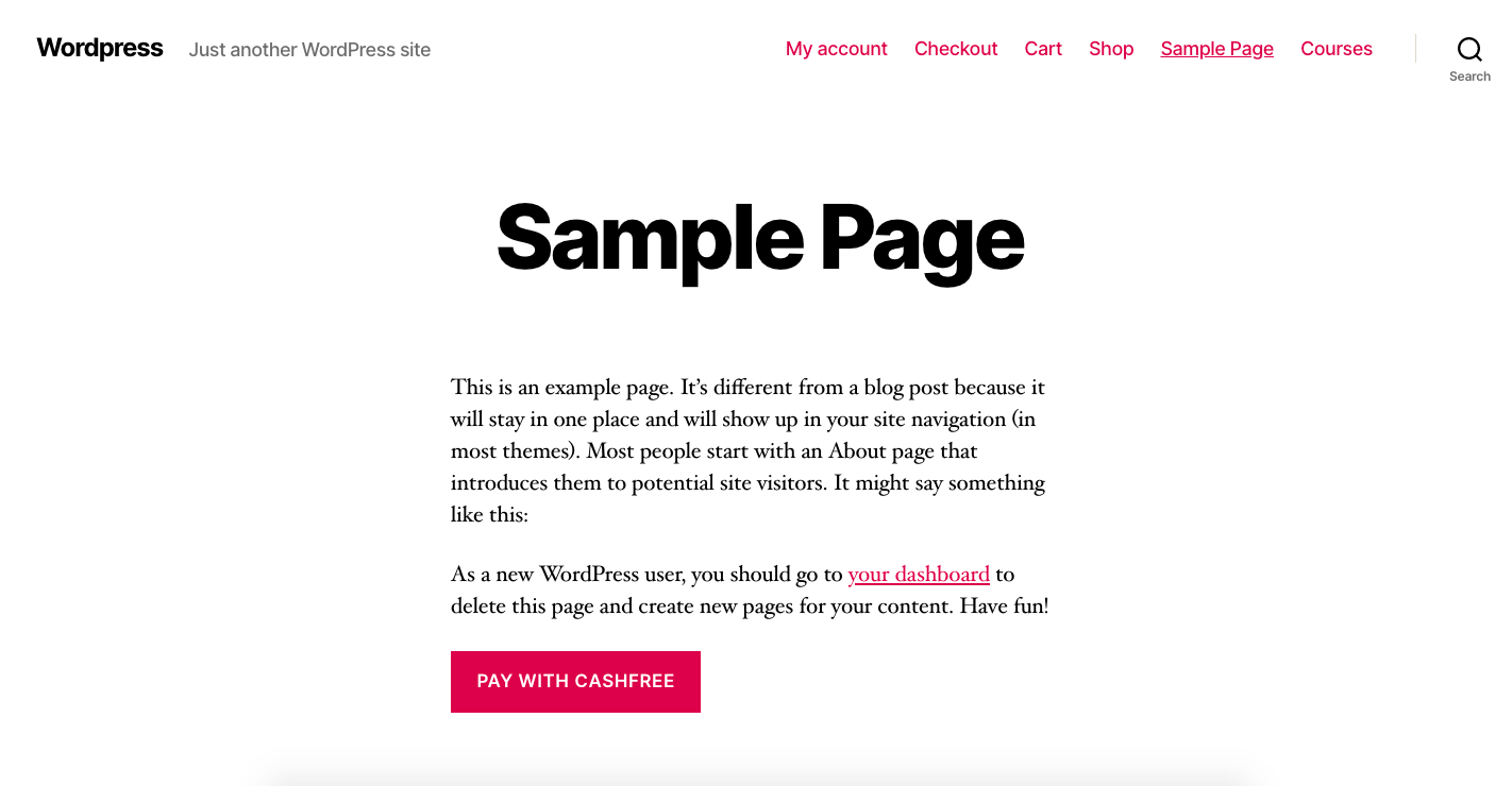 - Publish the page to see the Pay with Cashfree button. Customers can complete the payment by clicking the button on the page.