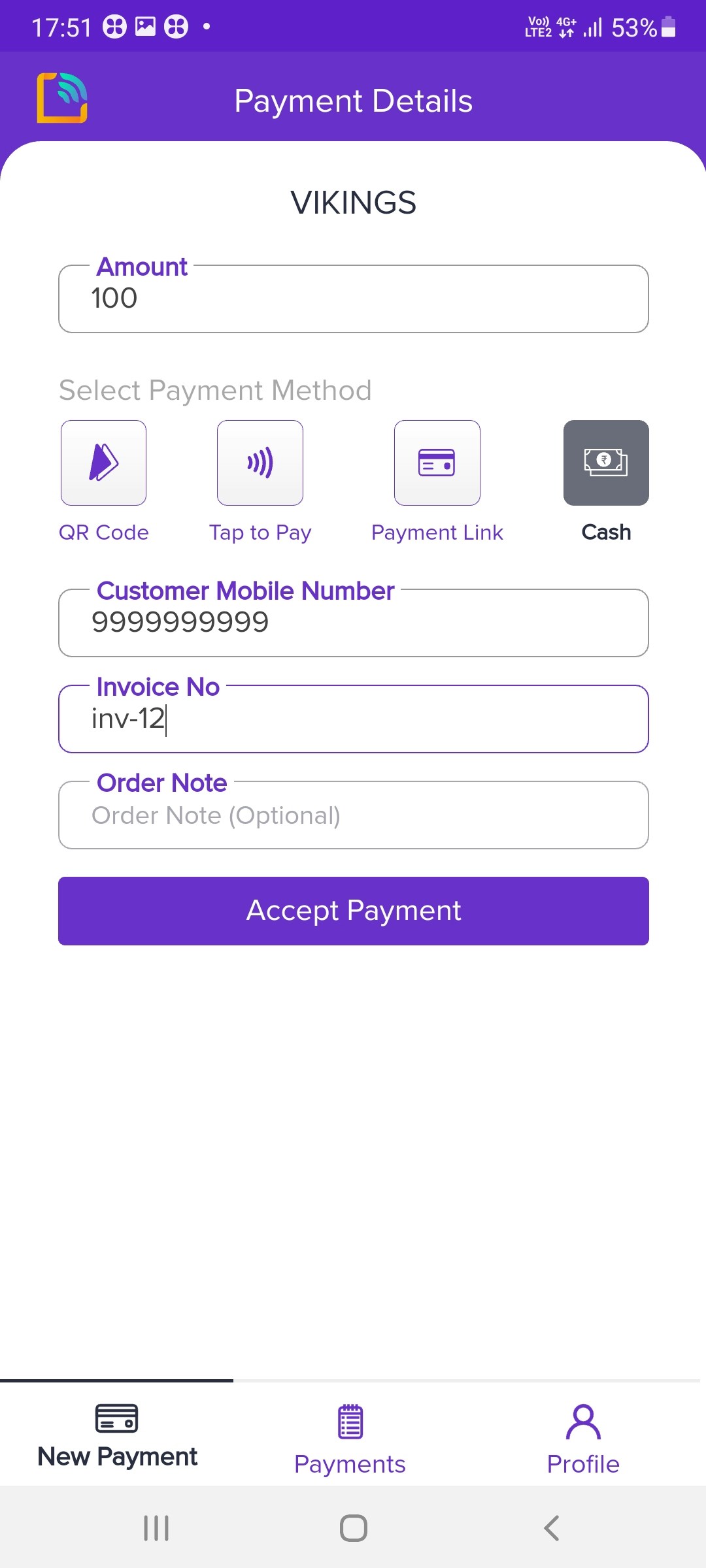 To accept payment via Cash,- Tap the Cash option in the softPOS application and enter the amount.