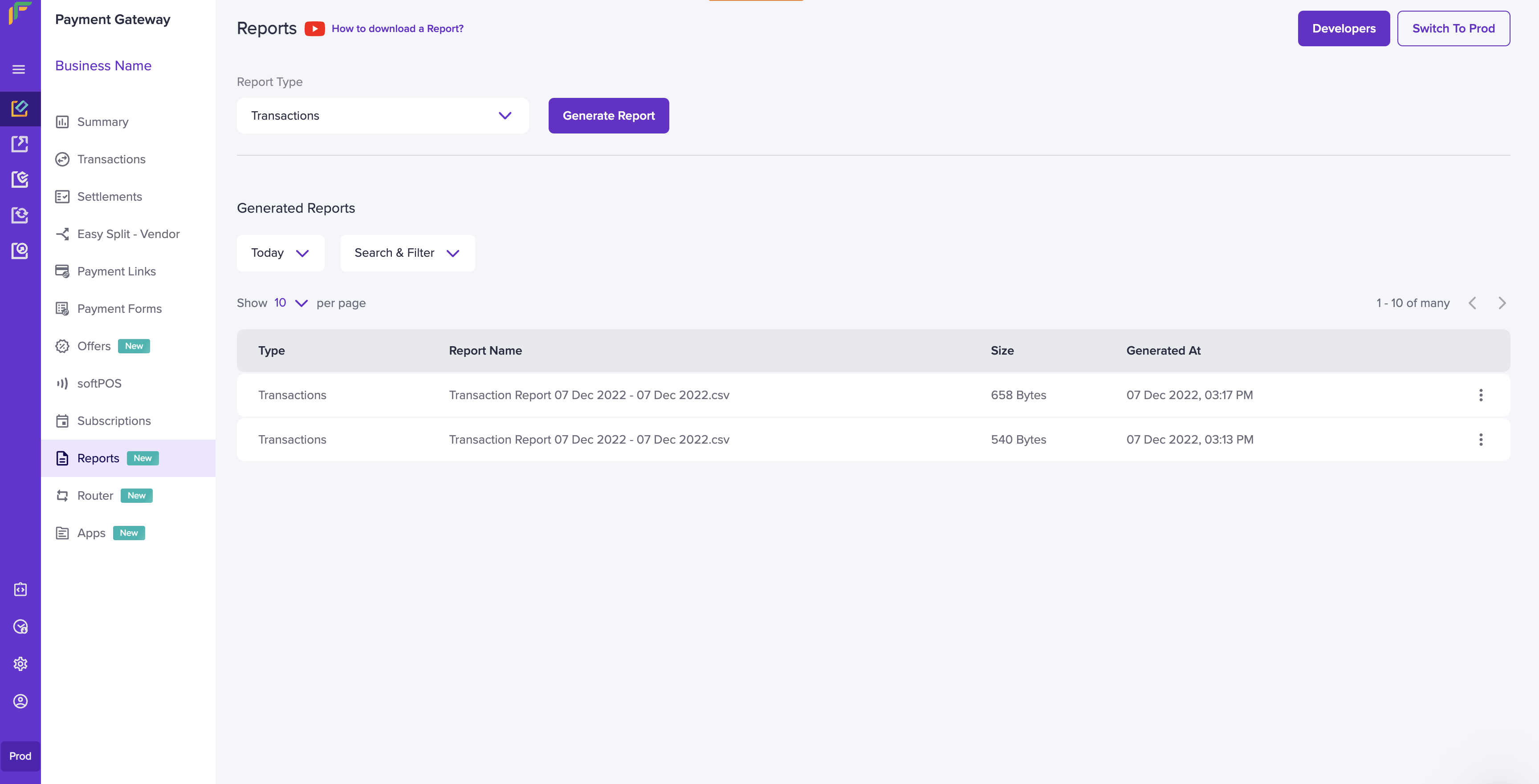As soon as you log in to your Cashfree account, the Summary section in the payment gateway dashboard will give you instant context as to what is the amount of transaction that has happened on that particular day, and the settlement amount that you’re yet to receive. Besides this, Cashfree also provides a wide range of reports to analyze your business finances. The different reports that Cashfree provides you are,