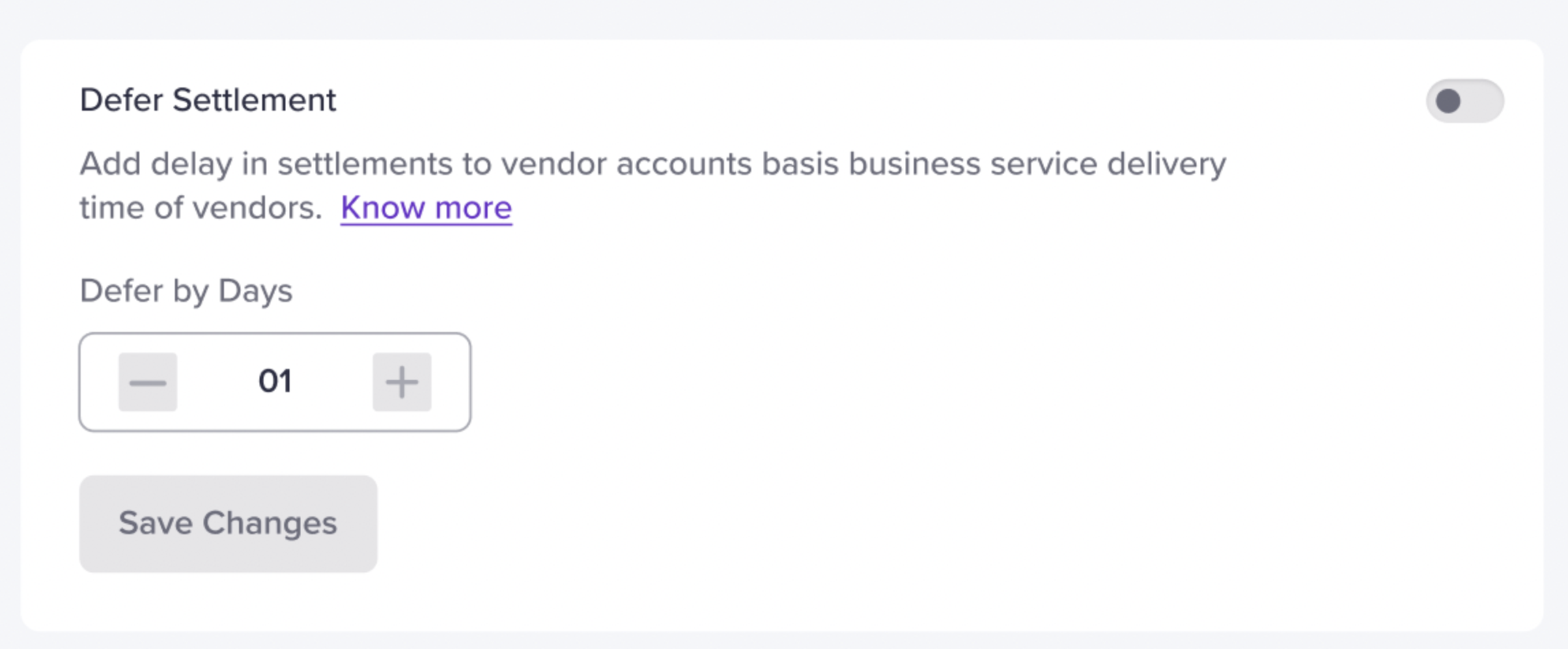 The Defer by Days value determines the number of the days by which the settlement will be delayed to vendors. For example, if you set the Defer by Days value to 5, the settlements to the vendors will be delayed by 5 days from the date of transaction.