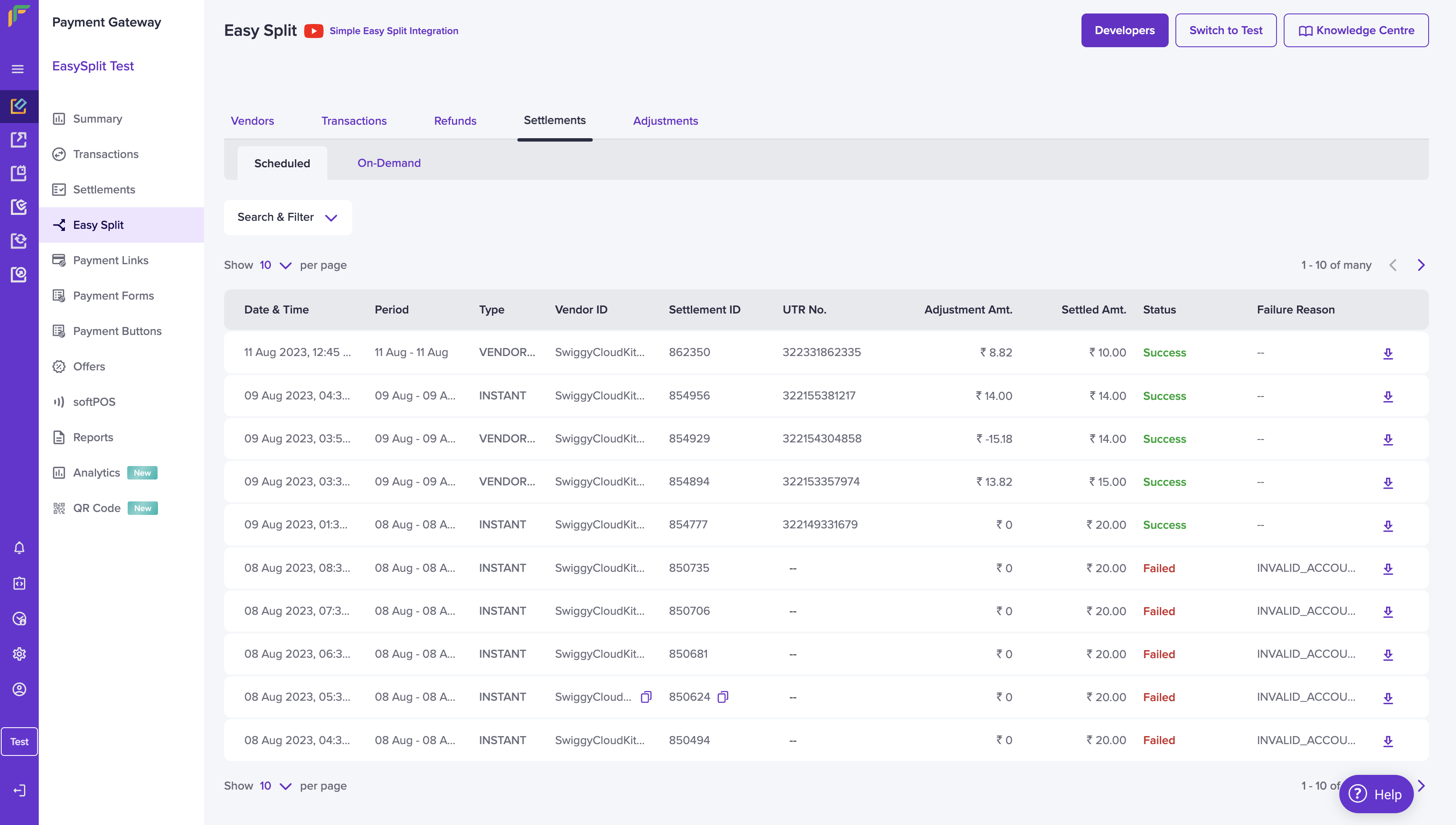 - Go to Payment Gateway Dashboard > Easy Split > Settlements > Scheduled