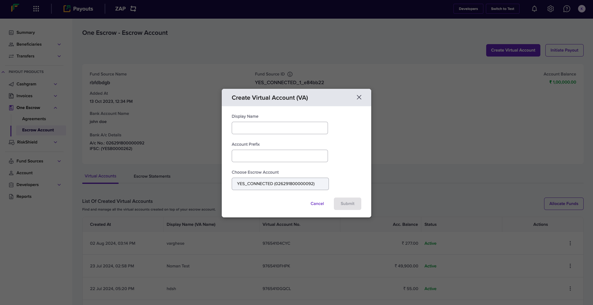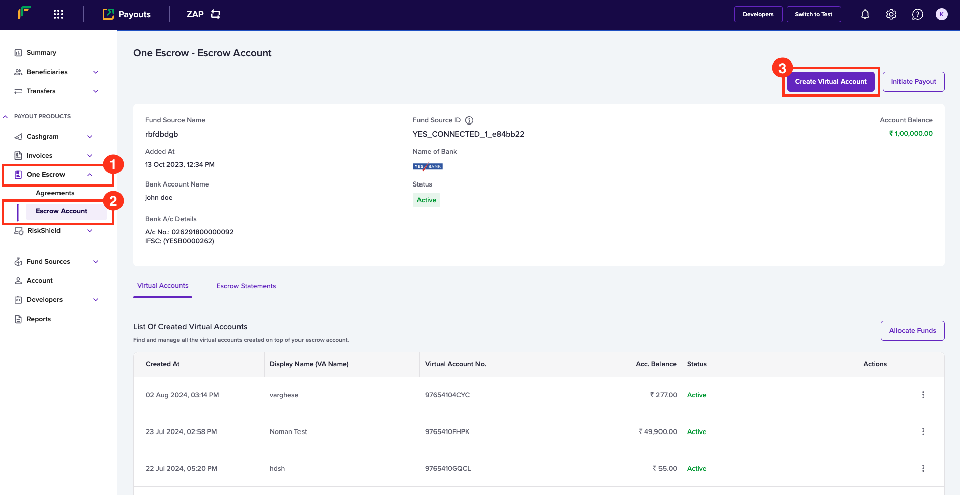 - Click Create Virtual Account in the One Escrow - Escrow Account page.