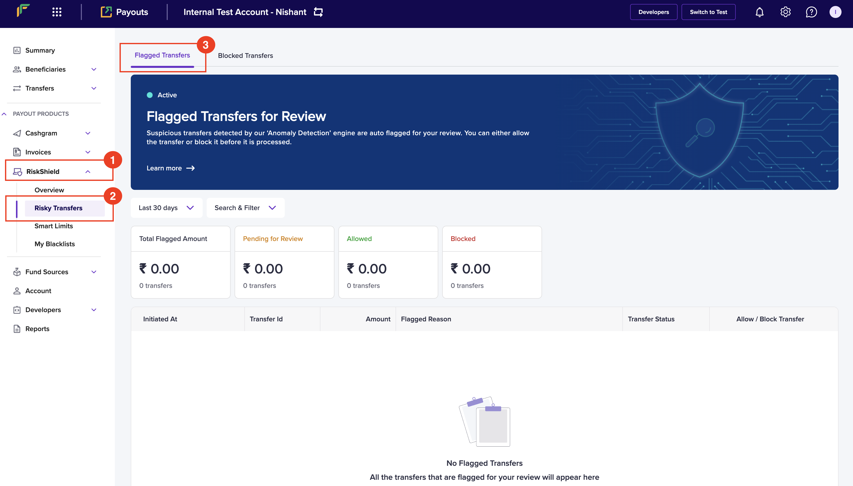 We put in the transfers for your review under the Flagged Transfers tab. The idea is for our merchants to review the authenticity of the initiated transfer and decide to approve or reject the transfer. Follow the instructions below to view the transfers for review:- Once you log in to the dashboard using your Cashfree Payments credentials, navigate to Payout Protect > Risky Transfers.
