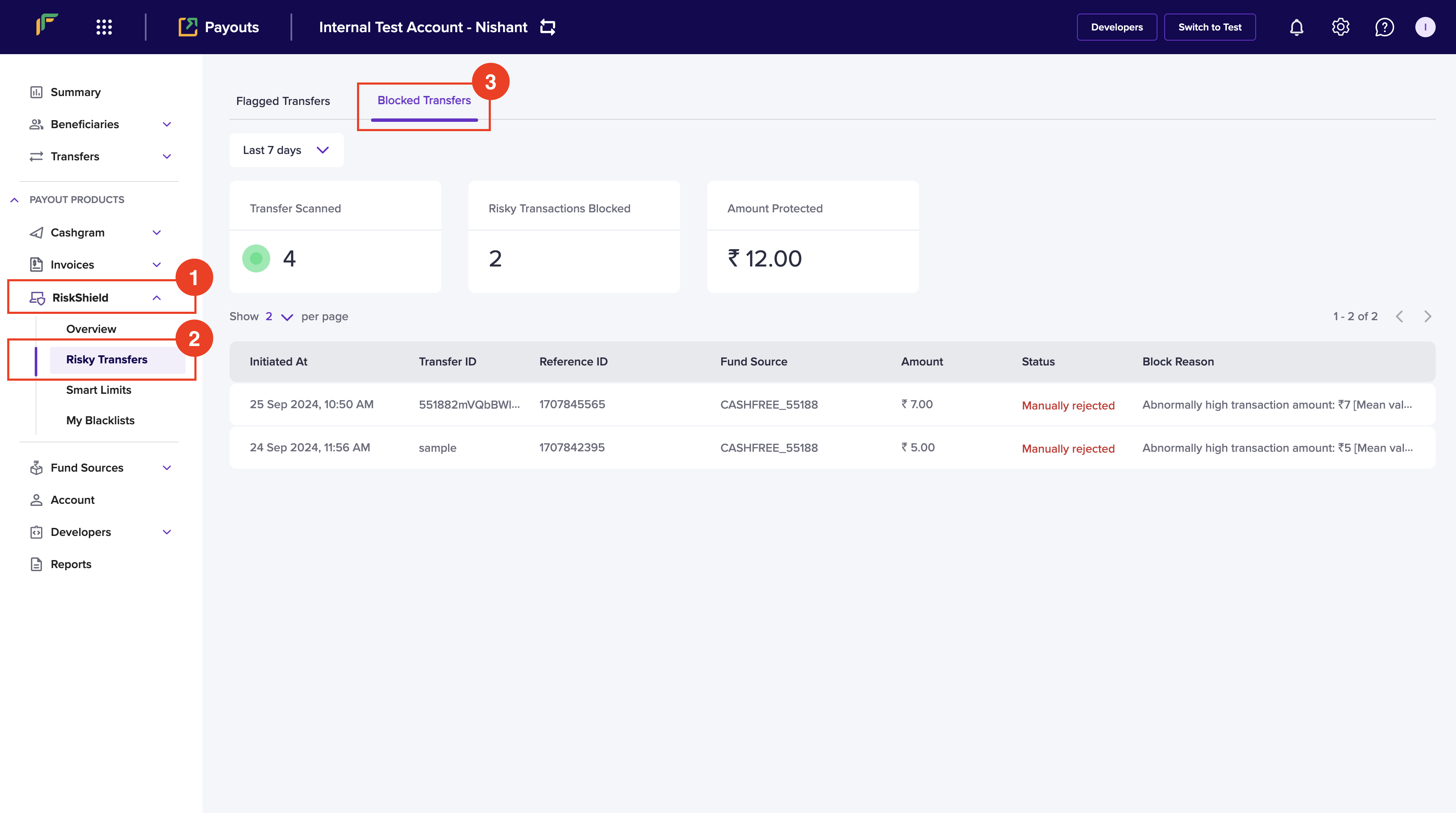A blocked transfer cannot be unblocked. The transfer journey of that specific transfer ends here. The screen gives you the data of the number of transfers scanned, blocked, and the amount protected. To view the blocked transfers, follow the instructions below:- Log in to the dashboard using your Payouts credentials and navigate to Payout Protect > Risky Transfers.