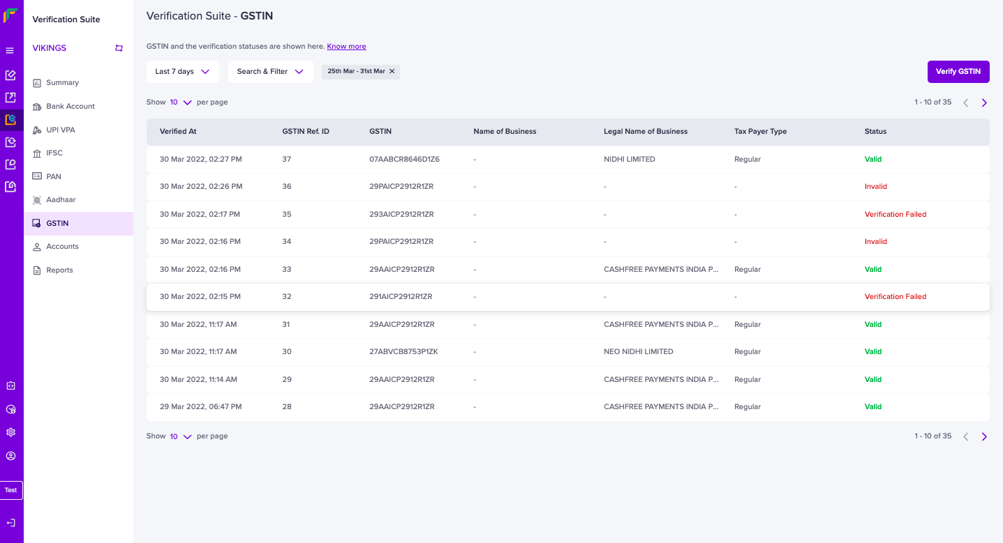 - Go to Verification Suite Dashboard > GSTIN > click Verify GSTIN.