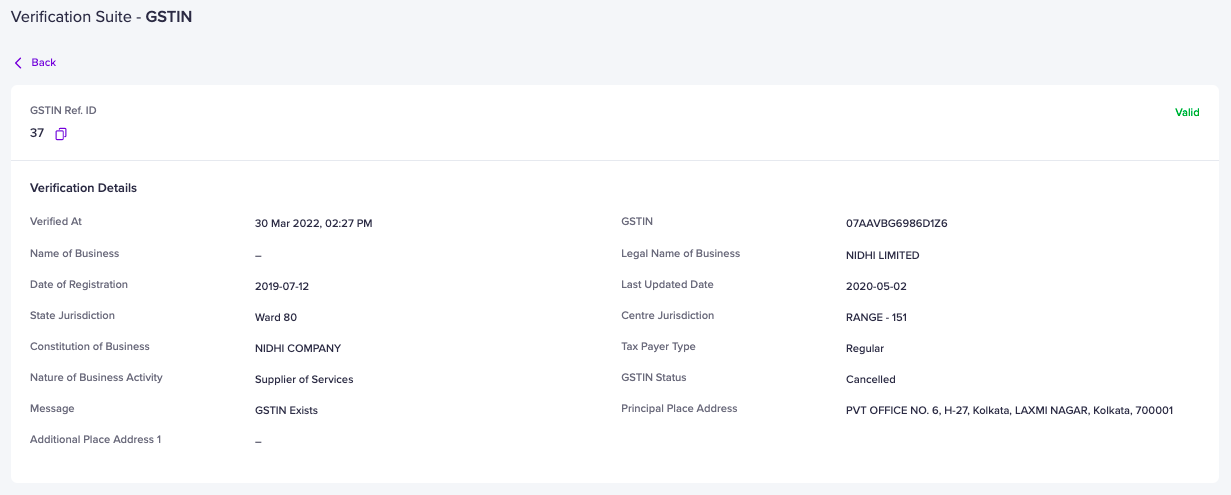 The system will return whether the GSTIN is valid or not along with the following details (if valid):
