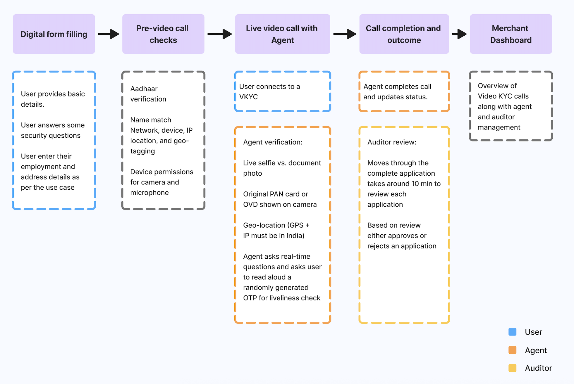 | Agent | KYC agent verifying identity | Conduct the video call and verify user identity. |
