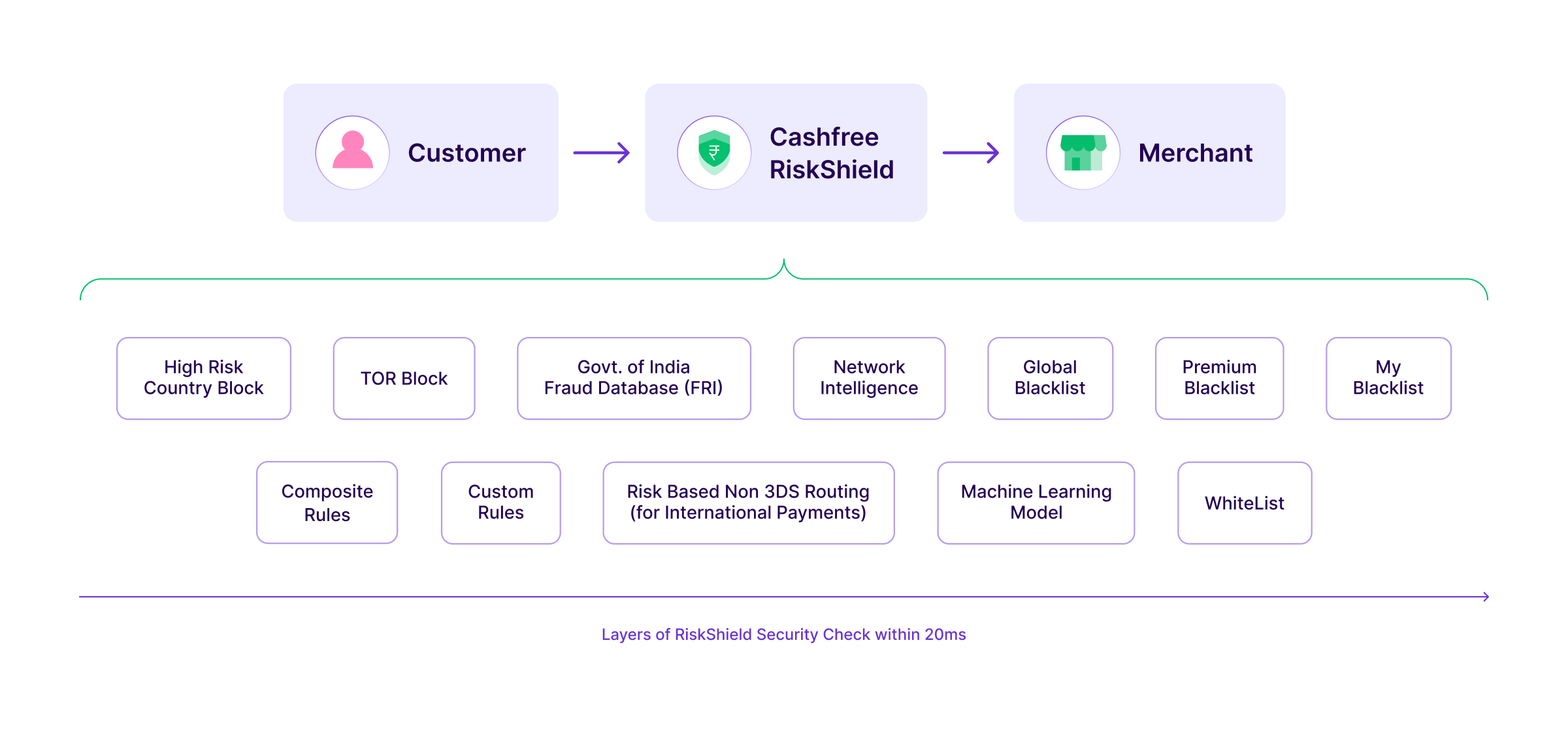 - Transaction Risk and Fraud: Detects and prevents high-risk transactions using ML-driven fraud monitoring, various checks and Integrations with the Government of India, available within RiskShield by Cashfree.